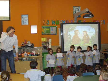 Todos los animales ayudaban al pequeño mono a encontrar a su mamá, a la que por cierto, se parecía mucho. Luego, entre todos, lo representamos en inglés, porque spider, bat, elephant, monckey... son viejos amigos nuestros y, cada día, vamos descubriendo más cosas acerca de ellos..