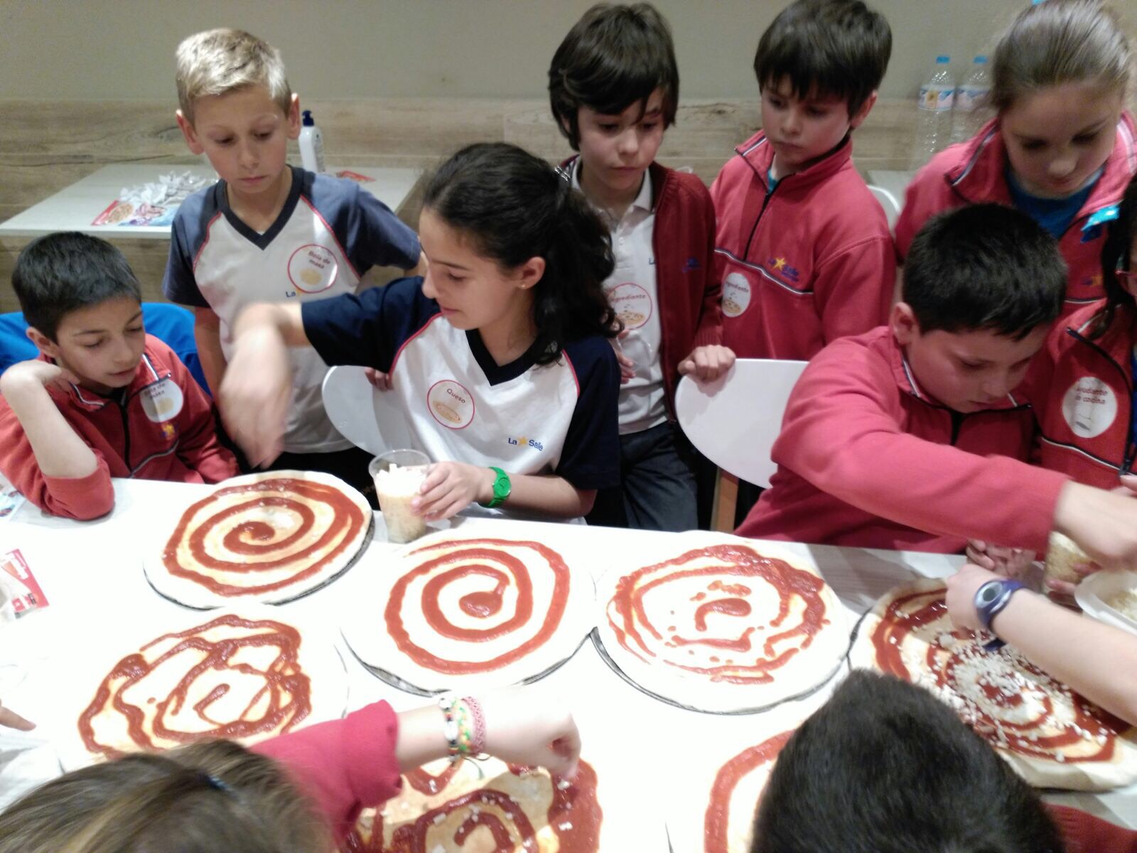 Después de esta primera parte, llegó el momento más divertido, ¡la puesta en práctica! Para ello, primero nos dividieron en equipos (bola de masa, tomate, queso, ingredientes y ayudantes de cocina) y después nos pusimos manos a la obra. Después de un rato de divertido trabajo, nuestras pizzas estuvieron listas.