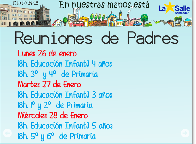De igual modo, en las reuniones de Educación Primaria también se han abordado contenidos muy variados que abarcan desde la lectura, escritura y cálculo, las salidas culturales, el manejo del Educamos, el aprendizaje cooperativo, los programas La Salle, la marcha de la clase, la mentira en el niño y la Educación Física al comienzo de la Etapa. Mientras que en los siguiente cursos los asuntos han versado sobre los recursos que empleamos en el aula (pizarra digital, agenda, libros, tabletas…), la implantación de la LOMCE, hábitos lectores, la educación en valores, el Amazing Camp, las tareas pros y contras, qué hacer con el ocio en casa (uso de videojuegos), Aula Abierta en Bujedo o el autocontrol y la agresividad en los últimos cursos de primaria, así como el uso de internet o del WhatsApp. Todos estos temas se han abordado acompañados de la entrega de notas de la segunda evaluación.